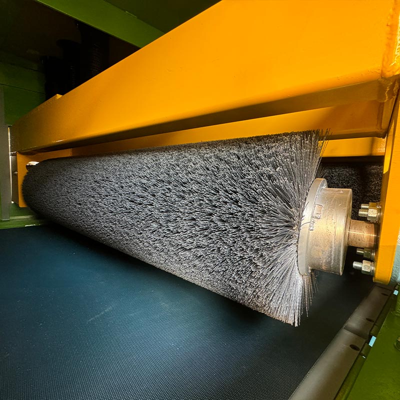 kummist roomikkonveieri süsteem, kus 8 komplekti abrasiivseid harjarulle täidavad järjestikku kareda ja peene
